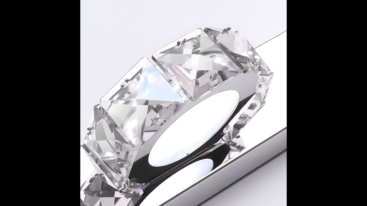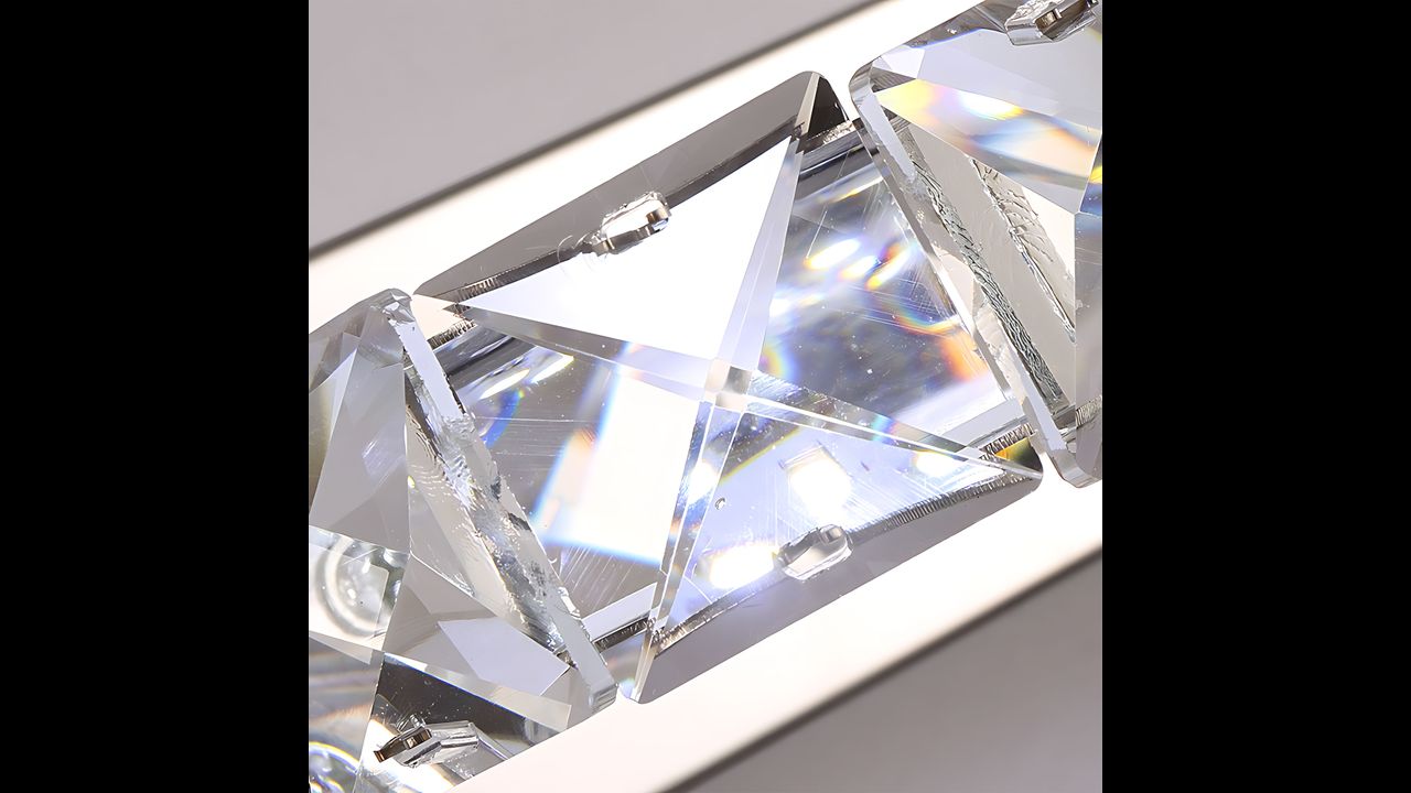 L’applique è dotata di paralumi rotondi realizzati con elementi sfaccettati ispirati al cristallo, che diffondono la luce in modo splendido. In questo modo si creano riflessi luminosi delicati e multidimensionali, che donano allo spazio una luminosità elegante e un’atmosfera speciale. La luce che si riflette sulle superfici sfaccettate crea un effetto di lusso e leggerezza, caratteristico degli interni glamour.