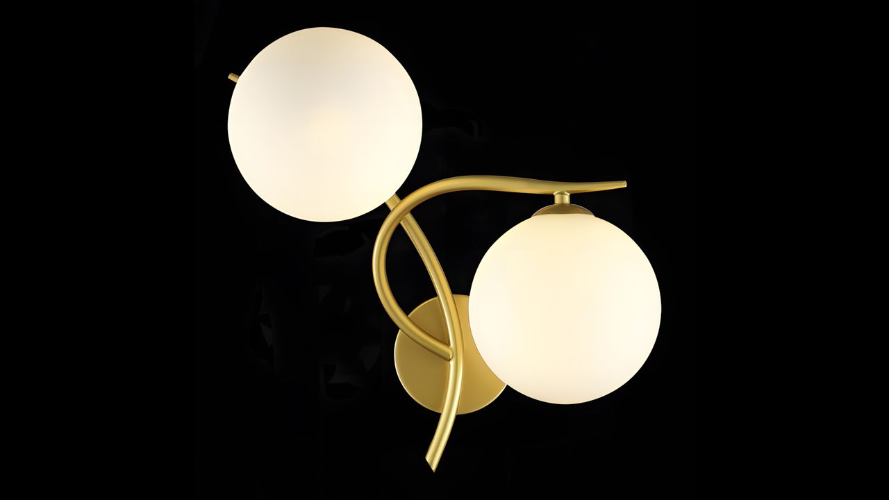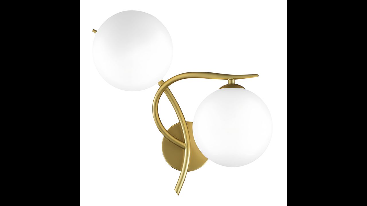 La raffinata applique in finitura dorata unisce un’eleganza delicata a una forma moderna. Due diffusori sferici bianco latte diffondono la luce con dolcezza, creando un’atmosfera accogliente e suggestiva, ideale per il soggiorno, la camera da letto o il corridoio.