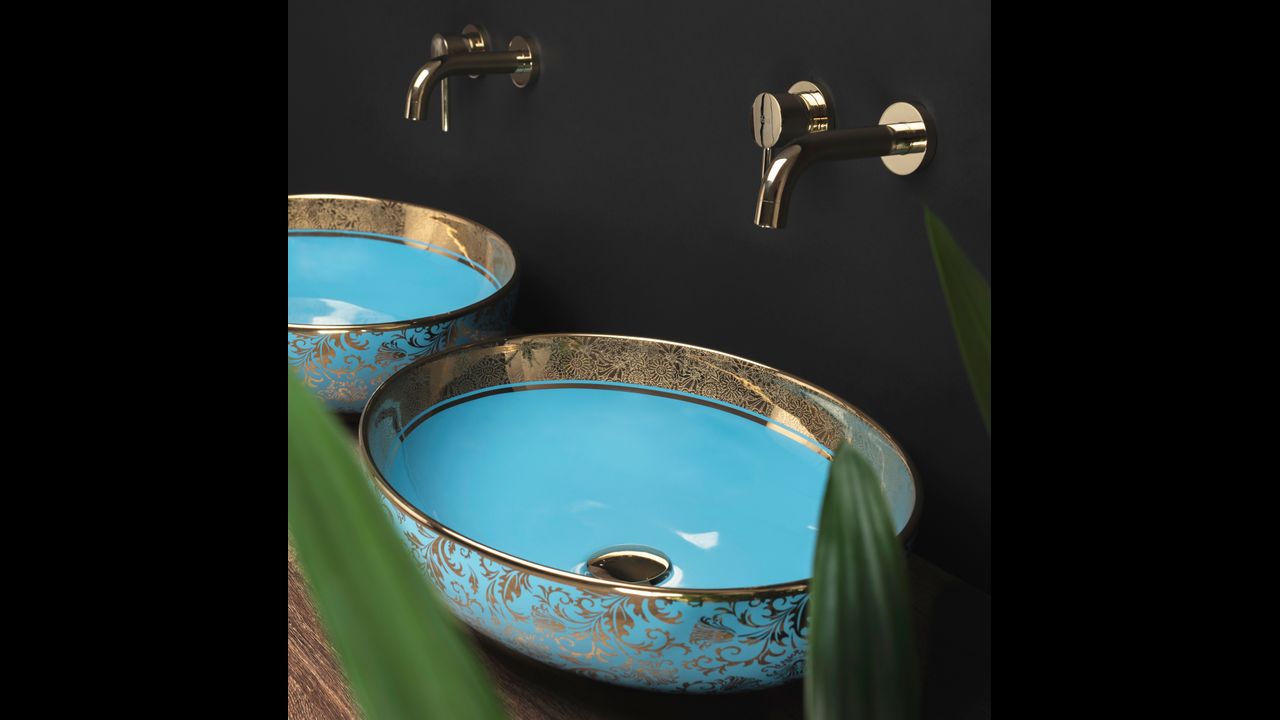 È un prodotto che riempirà perfettamente lo spazio del bagno mantenendo un aspetto e un’estetica interna impeccabili. Il bacino è rivestito di un bel colore dorato con un motivo floreale, che contrasta con il colore blu.