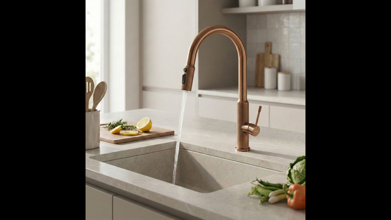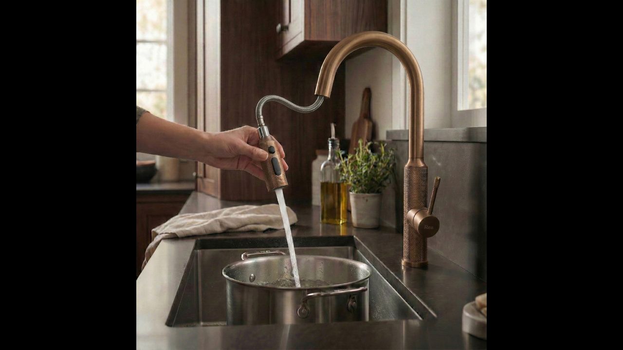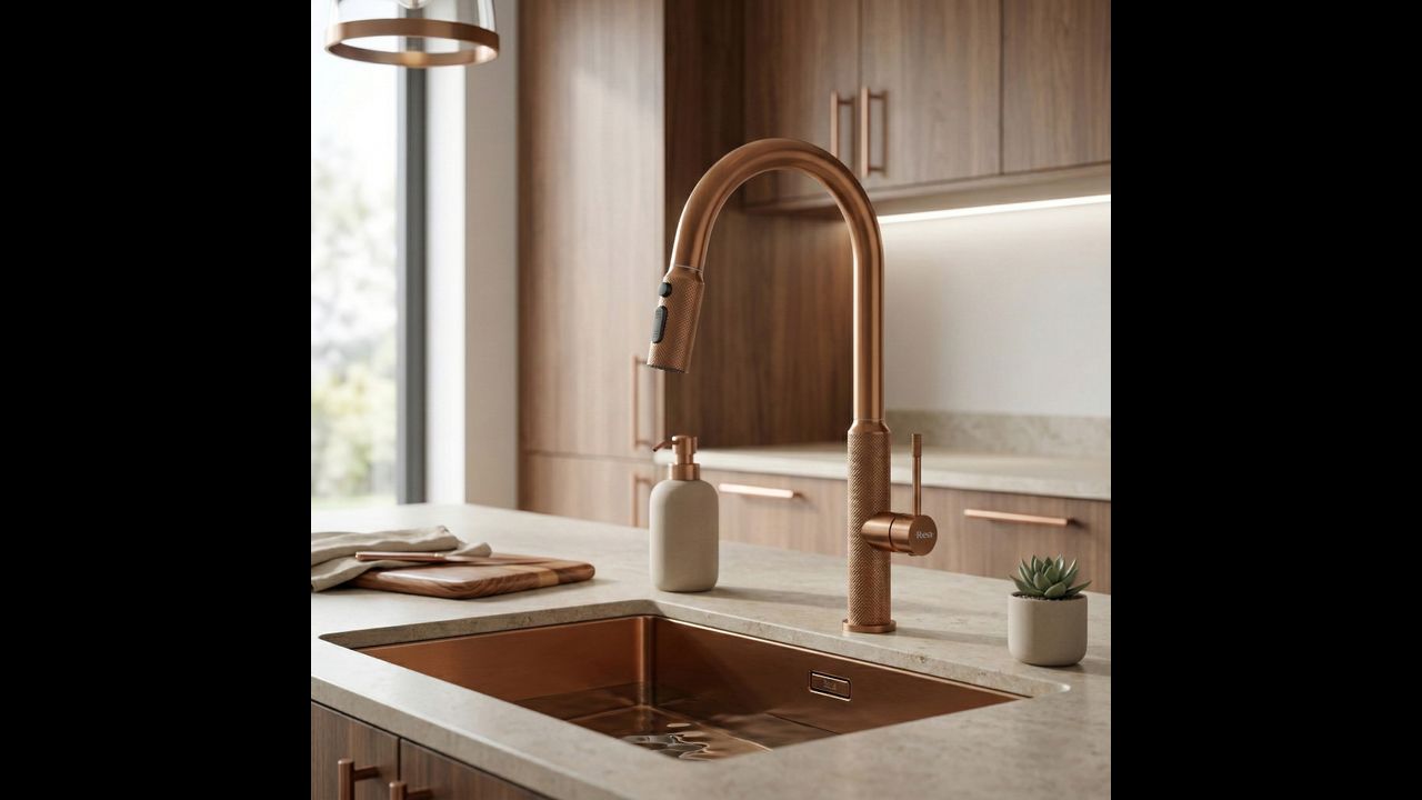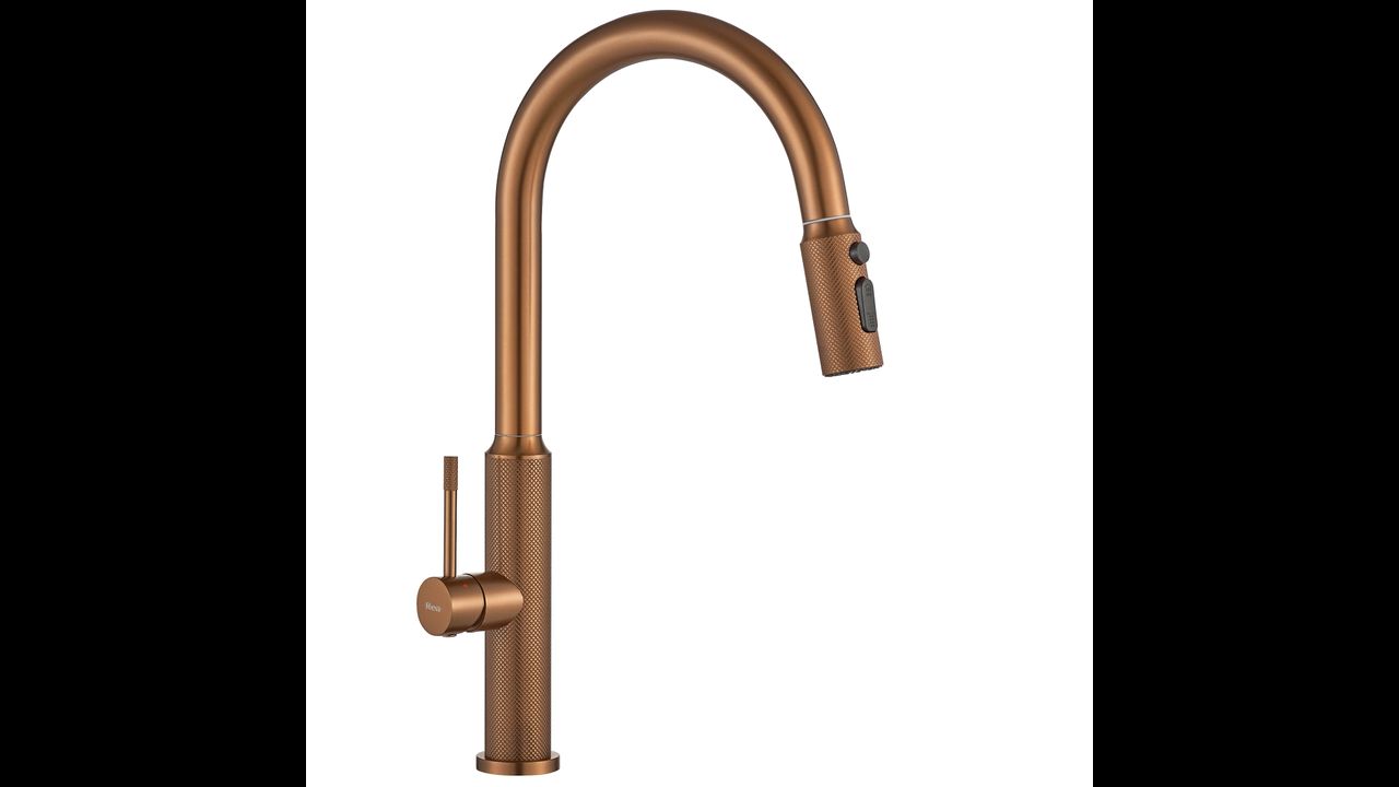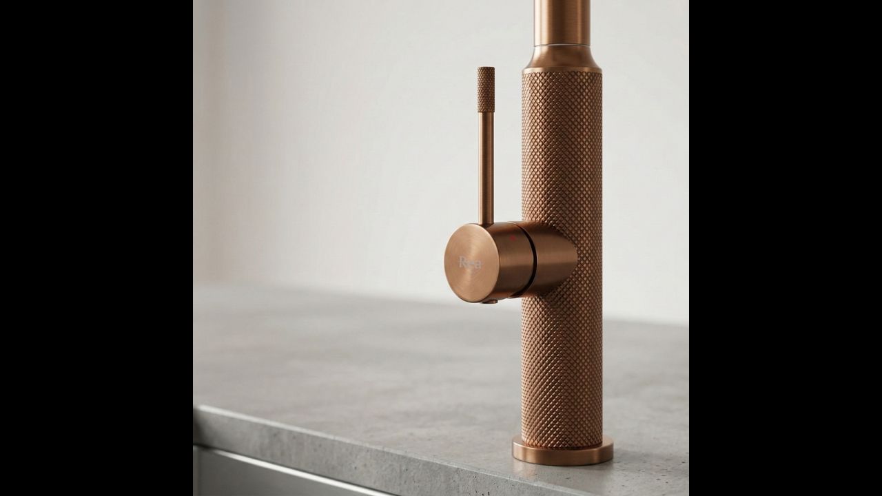 Rubinetto da cucina Rea Master in finitura rame spazzolato unisce design industriale e tecnologia avanzata, donando alla cucina un carattere distintivo. Realizzato in ottone massiccio e rifinito in una calda tonalità opaca di rame, rappresenta una soluzione durevole ed estremamente estetica per chi cerca elementi fuori dagli schemi.
